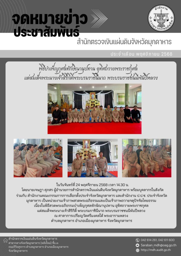 ในวันจันทร์ที่ 24 พฤศจิกายน 2568 เวลา 14.30 น. โดยนายเจษฎา ศุภสร ผู้อำนวยการสำนักตรวจเงินแผ่นดินจังหวัดมุกดาหาร พร้อมบุคลากรในสังกัด ร่วมกับ สำนักงานคณะกรรมการการเลือกตั้งประจำจังหวัดมุกดาหาร และสำนักงาน ป.ป.ช. ประจำจังหวัดมุกดาหาร เป็นหน่วยงานเจ้าภาพสวดพระอภิธรรมและเป็นเจ้าภาพถวายจตุปัจจัยไทยธรรม เนื่องในพิธีสวดพระอภิธรรม บำเพ็ญกุศลทักษิณานุปทาน อุทิศถวายพระราชกุศล แด่สมเด็จพระนางเจ้าสิริกิติ์พระบรมราชินีนาถ พระบรมราชชนนีพันปีหลวง