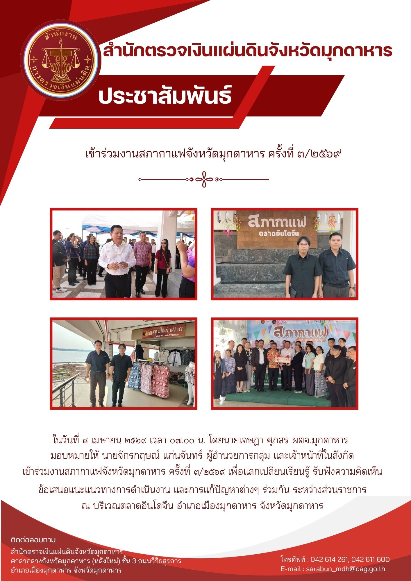 ในวันที่ ๘ เมษายน ๒๕๖๙ เวลา ๐๗.๐๐ น. โดยนายเจษฎา ศุภสร ผตจ.มุกดาหาร
